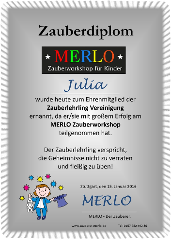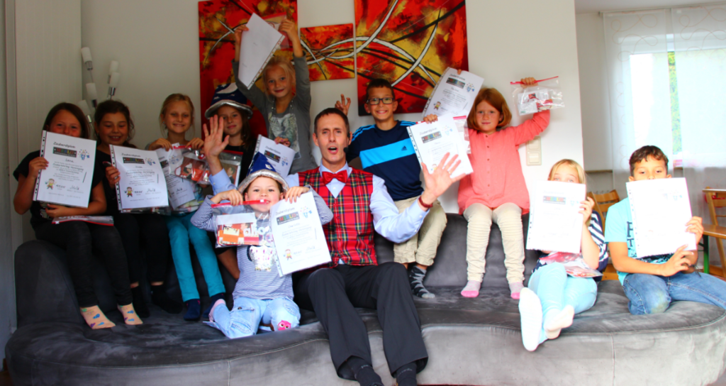 Jedes Kind bekommt auch alle benötigten Zauberutensilien mit dazu, so dass die Kinder die erlernten Kunststücke zu Hause gleich vorführen können.